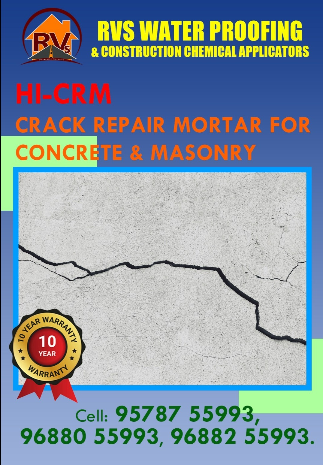 Cracks in concrete and masonry can weaken your structure and cause water seepage. RVS HI-CRM Crack Repair Mortar provides a durable, long-lasting solution with a 10-year warranty. Protect your building today! Contact Us : 95787 55993 , 95143 55993 . #CrackRepair #WaterproofingSolutions #ConcreteProtection #MasonryCare #RVSWaterproofing #DurableHomes #LeakageControl #StructuralSafety